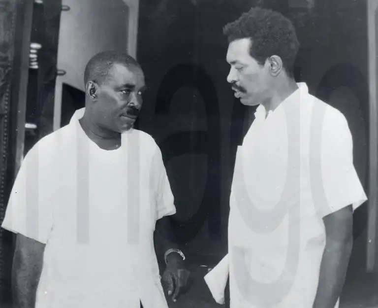 Picha: Rais wa kwanza wa Zanzibar, Abeid Karume (kushoto), katika mazungumzo na Abdulrahman Babu