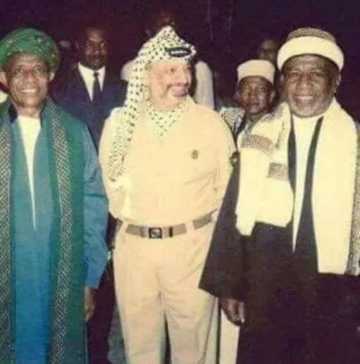 Maelezo ya Picha. Aliyekuwa Kiongozi wa Wapalestina, Yasser Arafat (katikati), akiwa katika picha ya pamoja na Rais wa zamani wa Comoro, Ahmed Abdallah (kushoto) na aliyekuwa Mufti wa Comoro Sayyid Muhammad Abdulrahman (kulia), wakati alipotembelea taifa hilo kwenye miaka ya nyuma.