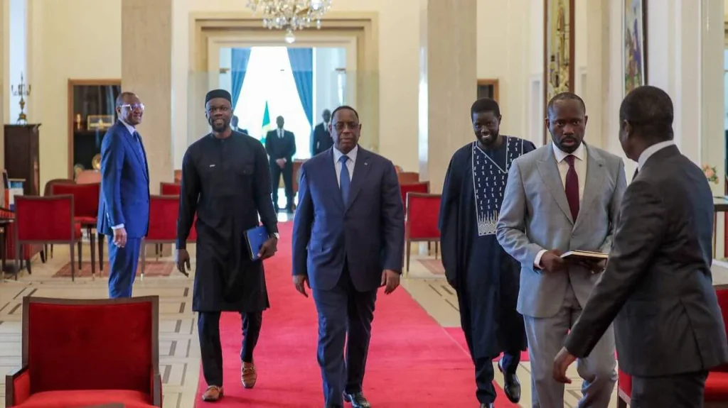 Rais Macky Sall wa Senegal akiwatembeza Rais mteule wa Senegal, Diomaye Faye (kushoto kwake) na Ousmane Sonko (kulia kwake) kwenye Ikulu ya Dakar hivi karibuni. Picha kutoka mtandao wa Quest France.