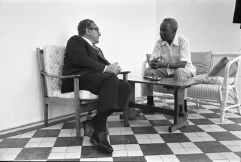 Kissinger: ‘Bila shaka tuko tayari kuwa na uelewa, na tuko tayari kufanya zaidi ya hayo, kuangalia msaada gani tunaweza kuutoa. Ni dhamira yangu kuwa na mawasiliano na viongozi kama wewe…Sisi tutaangalia kwa kuuzingatia Muungano wa Sovieti; nyiye mtaangalia kwa kuzingata Afrika huru. Lakini niko hapa kujifunza.Tunaamini kwamba bila ya utawala wa walio wengi, hapawezi kupatikana amani na maendeleo ya Afrika huru. Nchi nyingine zinaweza kushiriki. Viongozi kama wewe mnajua namna ya kuyatumia madola makubwa kwa maslahi yenu. Lakini ni tatizo kwetu kwa nchi kama Angola ambako kuna majeshi ya kigeni. Lakini azma yetu ni kuzuia hali kama hizo zisizuke.